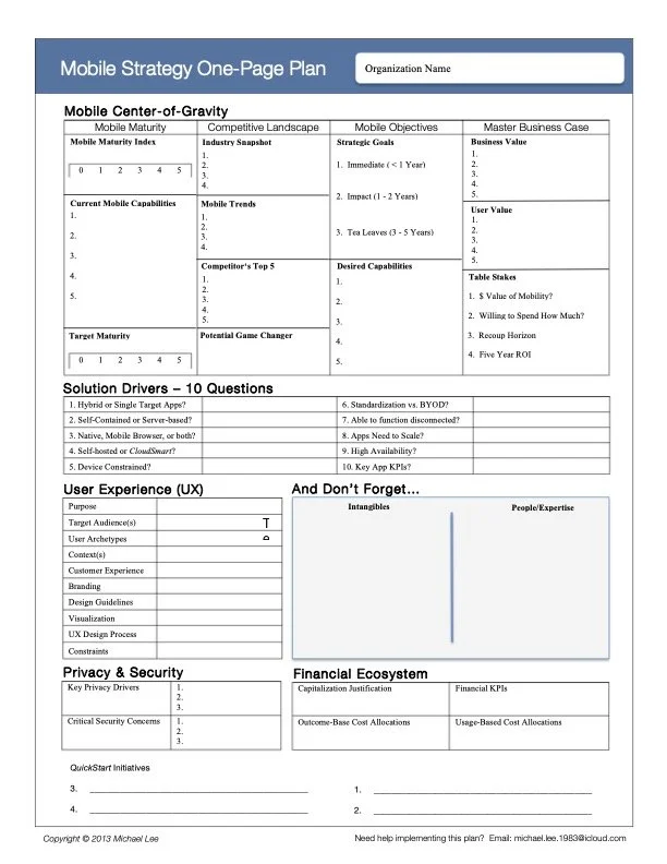 Strategic planning can be daunting. Tying all these elements together requires focus and leadership. But there is a tool to assist in this process: The One-Page Mobile Strategy Plan